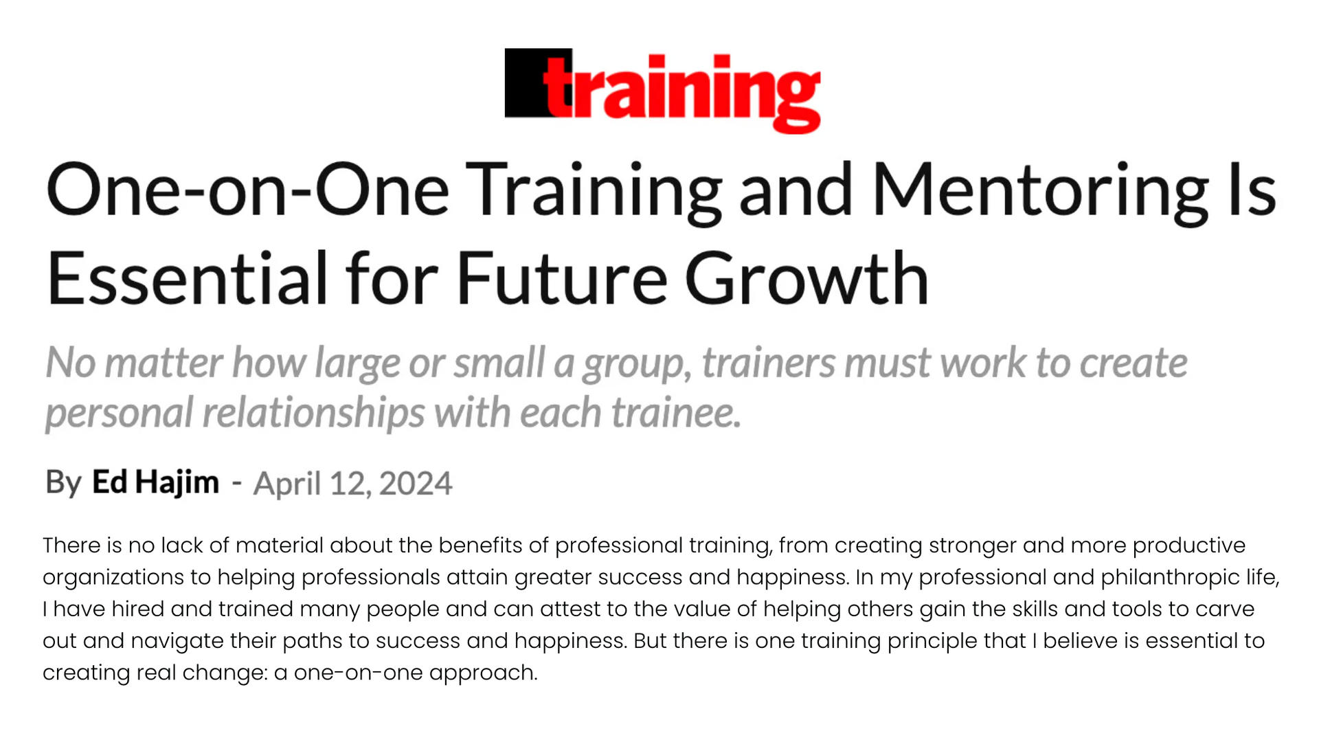 ONE-ON-ONE TRAINING AND MENTORING IS ESSENTIAL FOR FUTURE GROWTH